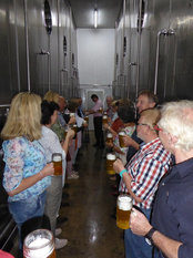 Beim Rundgang durch die Brauerei erklärte Uli Wiedemann das Reinheitsgebot näher, das natürlich auch bei Bucher Bräu gilt: Ins Bier darf nur Malz – gewonnen aus der Gerste – Hopfen und Rachelwasser aus der Gegend. Als Triebmittel wird Bierhefe verwendet und alle Sorten haben eine genau festgelegte Stammwürze, die immer gleich bleibt. Die Gäste konnten bei ihrem Rundgang unter anderem die riesigen Wasserspeicher, die Reinigungsanlage, den Gärkeller mit einer Temperatur von 5° Celsius, die Lagertanks mit einem Fassungsvermögen von 3.500 Hektoliter und die Flaschenfüllanlage und Etikettiermaschine bestaunen. Hier werden 12.000 Flaschen pro Stunde etikettiert.